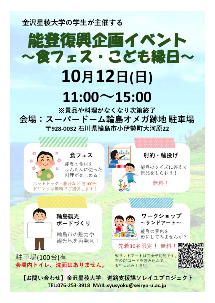 「能登ソレイユプロジェクト」のCチームは、10月12日(日)輪島市で、「能登と繋がる」をテーマにしたイベント「能登食フェス・こども縁日」を開催します!