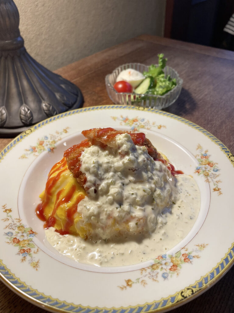 ふわふわの卵がサクサクの白身魚フライを包み込み、一口ごとに食感と風味のハーモニーが広がります。たっぷりかかったタルタルソースとの相性も抜群です。