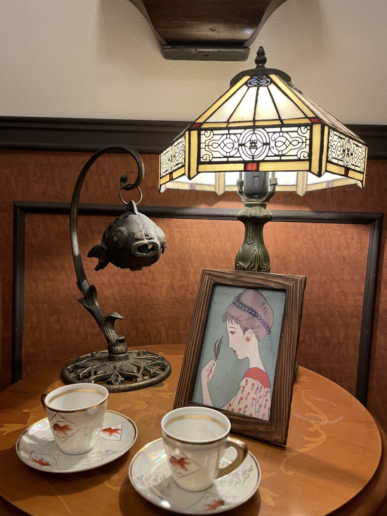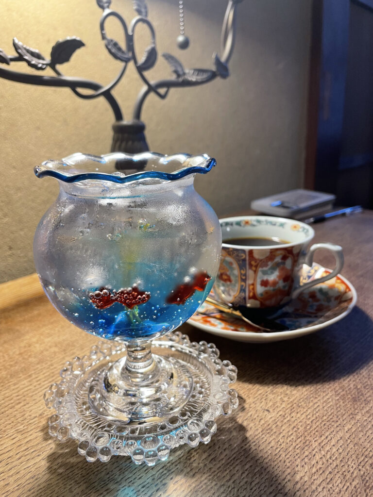 ひがし茶屋街のそばに静かに佇む金澤町家にお店を構える「大正浪漫喫茶 金魚庵」さん。店名の「金魚」は、金沢ゆかりの作家、室生犀星の小説「蜜のあわれ」に登場する金魚が元になっています。店内に足を踏み入れると、まるで大正時代にタイムスリップしたかのようです。「大正111年(=西暦2022年)創業」とうたっています。