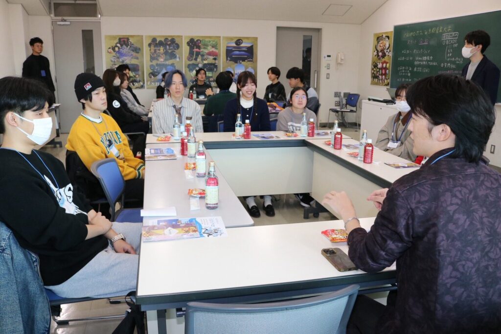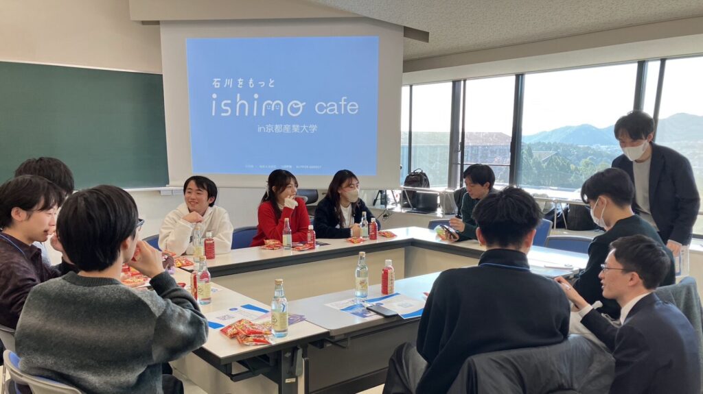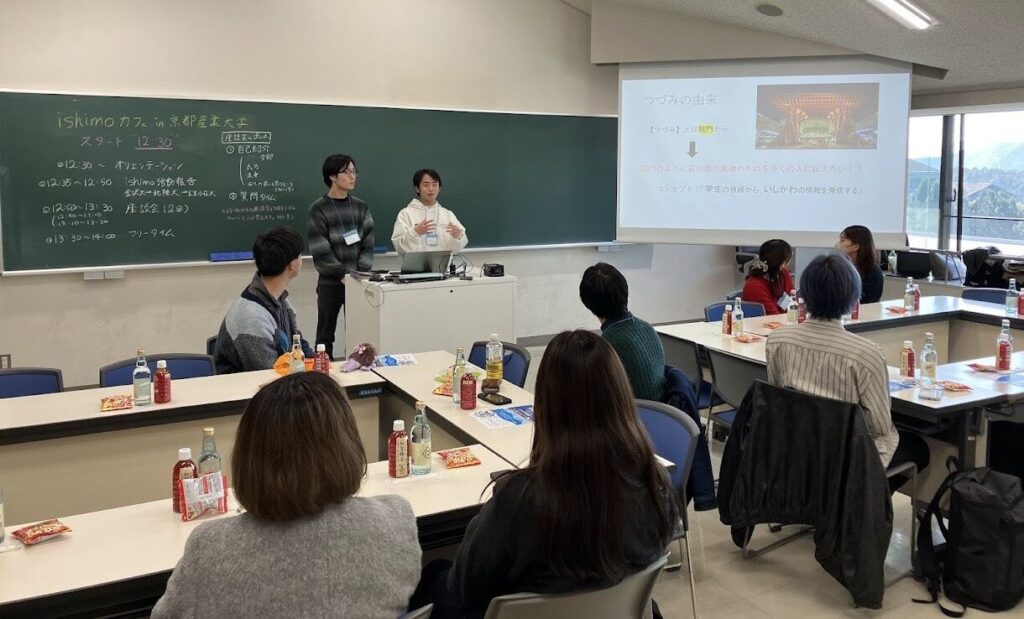 京都産業大学の学生さんにishimoとは何かを知ってもらうため、チームishimoによる活動報告を行いました。各チーム様々な方法で石川県の魅力を伝えました。