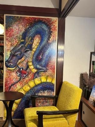 襖に描かれた龍と鯉は、美術家の藤本絢子さんの作品です。中国の登竜門の話から着想を得ており、こまつ町家文庫の発展を祈願して描かれたものかもしれません。こまつ町家文庫の原点である、龍助町の「龍」ともかけられているそうですよ。