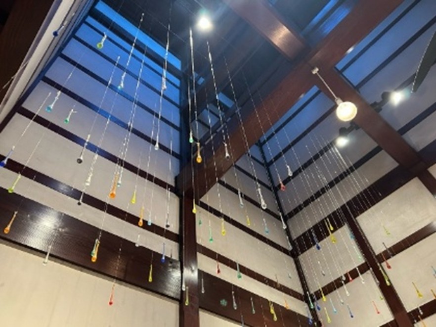 高い吹き抜けの天井を見上げると、100本のガラスでできた雫が展示されています。加賀市在住のガラス作家・秋友騰尊さんによるもので、金田さんの「可愛いものや奇麗なものを写真に残すことができるフォトスポットにしたい」という思いを反映させているのだとか。