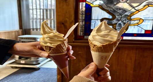 お買い物のあとは、隣接の売店で買ったソフトクリームでひとやすみ。醤油ソフトクリームと、玄米ソフトクリームの2種類がありました。近くのステンドグラスを背景に写真を撮ると、とてもフォトジェニックです。
